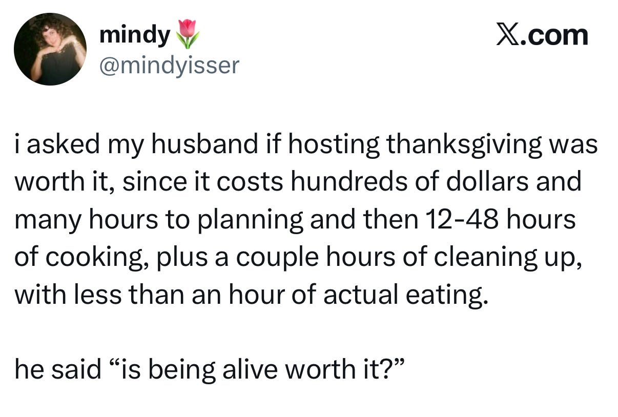 So yes, it’s fair for people to ask whether starting a business is worth it. Whether marriage is worth it. Whether having a child is worth it. Still, every time I hear the question framed this way, I think about that tweet. About Thanksgiving. About cooking for two days for one hour at the table and how that hour is the whole point.